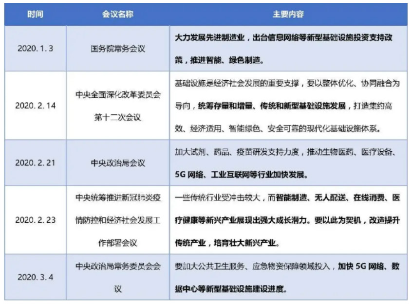 近日來,國家陸續出臺了新基建相關政策(如表1),社會上的關注度也在不斷增加,引發廣泛討論。新基建是相對于鐵公機等傳統基礎設施而言的新型信息網絡建設,主要涉及:5G基礎設施、特高壓、城際高鐵和軌道交通、新能源汽車充電樁、大數據中心、人工智能和工業互聯網七個領域。新基建三個字蘊含著無限發展的可能性。據央廣網報道,目前在新冠肺炎疫情沖擊和經濟下行壓力下,各省市已上報近25萬億元的基建計劃,其中很大一部分資金建設在新經濟領域,資源向新技術產業傾斜。