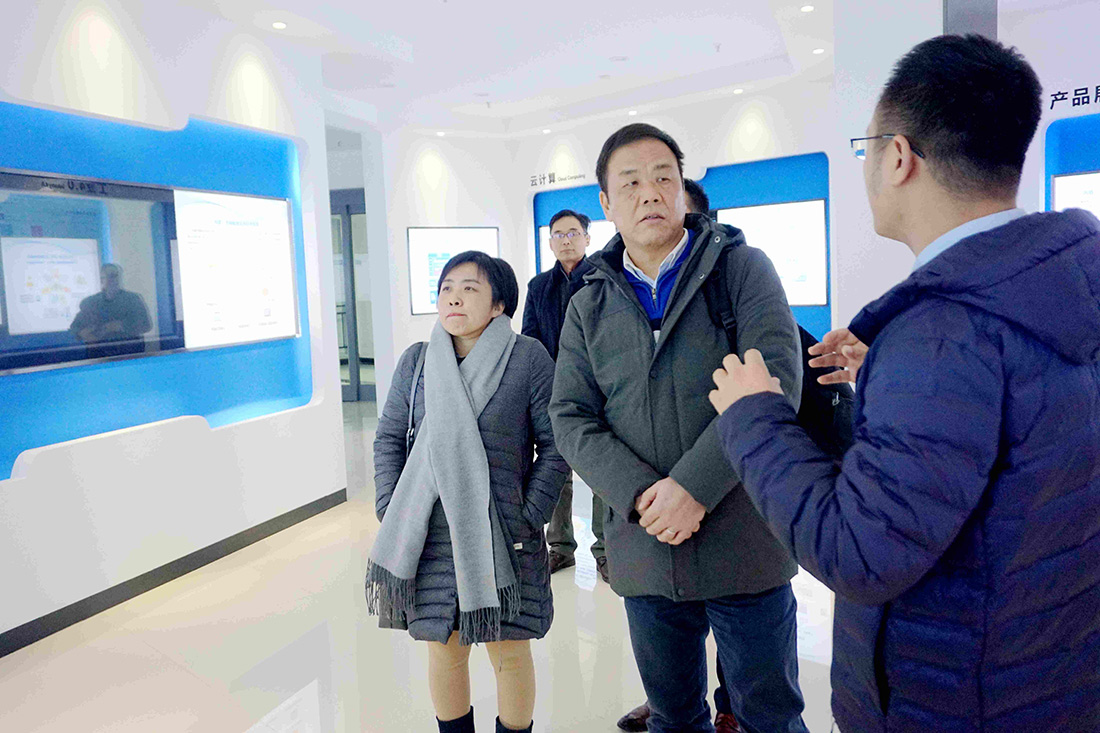 在金佳園展廳,蔡建國一行聽取了公司主營業務及發展規劃的介紹,并詳細了解了公司在云計算、工業4.0、信息安全、物聯網與人工智能、智慧城市六大領域的業務及產品情況。